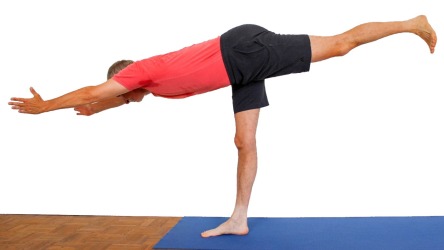 - Hebe das linke Bein nach hinten oben an und kippe dabei das Becken mit dem Oberkörper in gleichem Maß langsam nach vorn. Führe die Kippbewegung soweit fort, bis der Oberkörper und das gehobene Bein in der Waagerechten sind. Strecke die Arme dabei weiterhin ausgedreht nach vorn und oben.