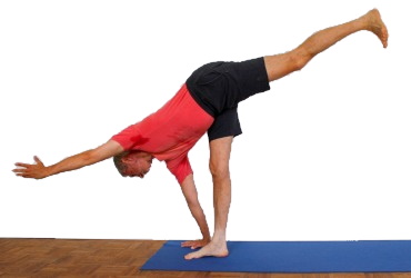 - Wie in der ardha vasisthasana generell, würde hier ein Mangel an Kraft der Abduktoren des Hüftgelenks auffallen, derart daß das Becken nicht auf der korrekten Höhe gehalten werden kann, sondern unhaltbar schwerkraftgemäß absinkt oder viel zu hoch gehalten wird. Bei diesem Übergang ist die Situation zusätzlich in der Phase, in der der erste auf den Boden gebrachte Fuß auf den zweiten gesetzt wird, verschärft, weil die Adduktoren des oberen Beins nicht mitarbeiten können, solange das Bein in der Luft ist. Diese Situation kann als eine zweite Stufe des Tests auf (deutlichen) Mangel an Kraft der Abduktoren genutzt werden.