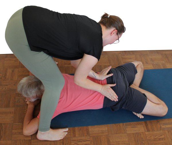 - Nimm die Haltung wie oben beschrieben ein. Der Supporter drückt das Kreuzbein ein wenig in Richtung Boden und deutlich vom Rücken weg in Richtung der Füße.