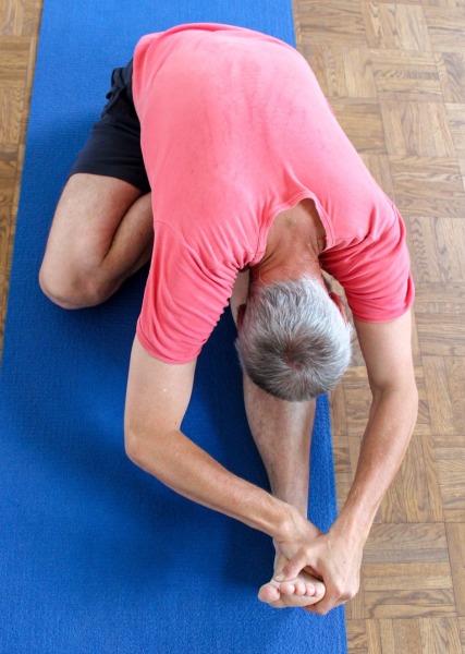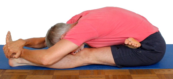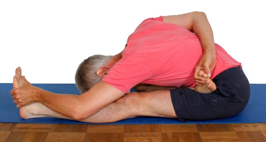 Hier sollte die Ischiocrurale Gruppe sehr gut vorbereitet sein, erstens damit die Vorwärtsbeuge so gut gelingt, dass der Fuß gegriffen werden kann und zweitens, da es sich um eine sitzende Vorwärtsbeuge handelt, damit die LWS sich danach nicht unangenehm anfühlt, wie es zuweilen nach sitzenden Vorwärtsbeugen zu beobachten ist. Hilfreich sind:
