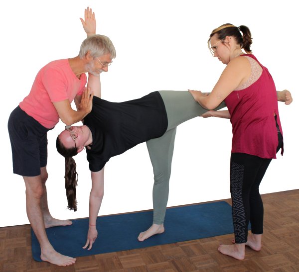 - Der Supporter, der das gehobene Bein weiter anhebt, muß darauf achten, daß er den Ausführenden nicht zu sehr in Richtung von dessen auf dem Boden befindlicher Hand kippt. Die Neigung dazu hängt natürlich auch von dem Druck ab, den der erste Supporter mit seinem Becken bzw. der Flanke gegen das Becken des Ausführenden ausübt. Außerdem muß er achtsam vorgehen, da in der Regel jegliches weitere Anheben des Beins unmittelbar zu einer Zunahme der Dehnungempfindung im Gracilis des Standbeins führt.