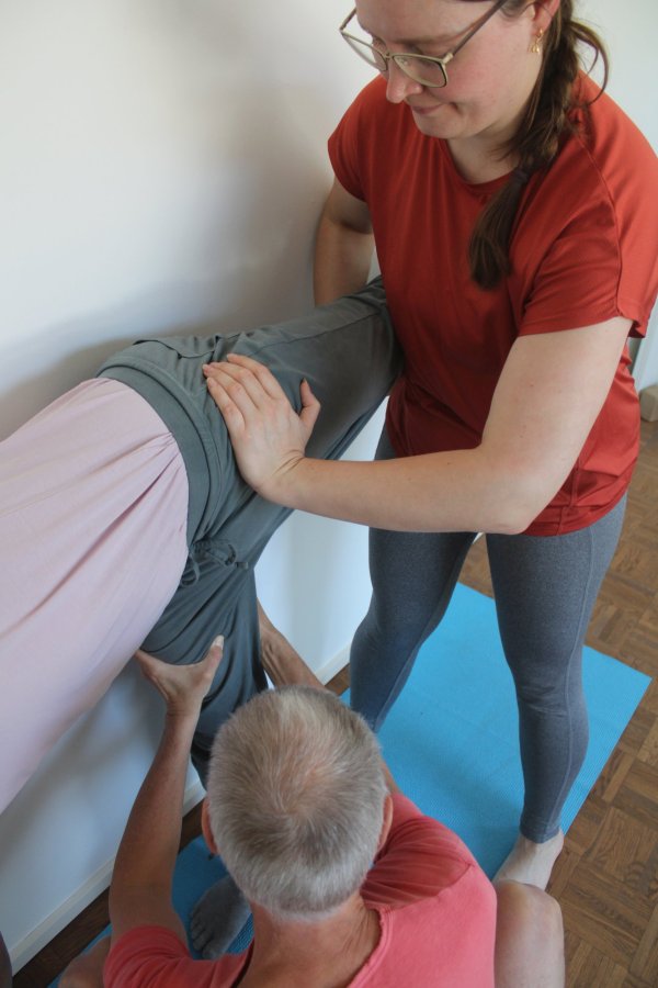 - Nimm die Haltung an der Wand ein. Der erste Supporter dreht das Standbein mit beiden Händen aus. Der zweite Supporter steht neben dem gehobenen Bein um dieses nach Verträglichkeit weiter anzuheben (Abduktion im Hüftgelenk), auszudrehen, gegen die Wand zu drücken, also im Hüftgelenk zu extendieren und im Kniegelenk durchzustrecken. Dabei soll nach Möglichkeit die Ferse gegen die Wand gedrückt werden, was mit dem Druck gegen den Oberschenkel das Kniegelenk automatisch mehr streckt.
