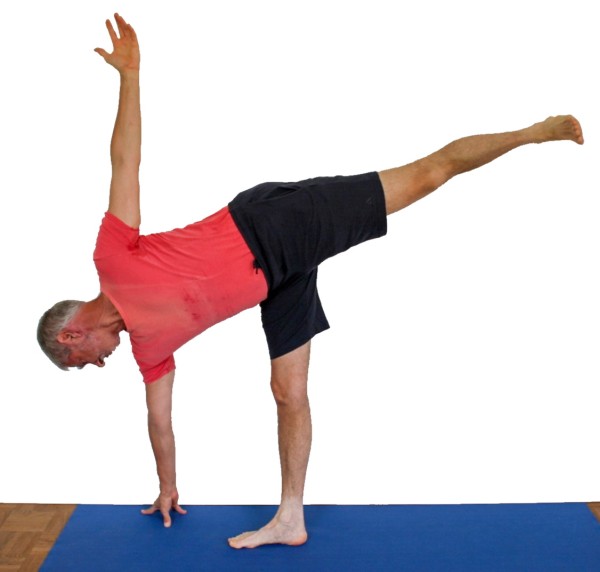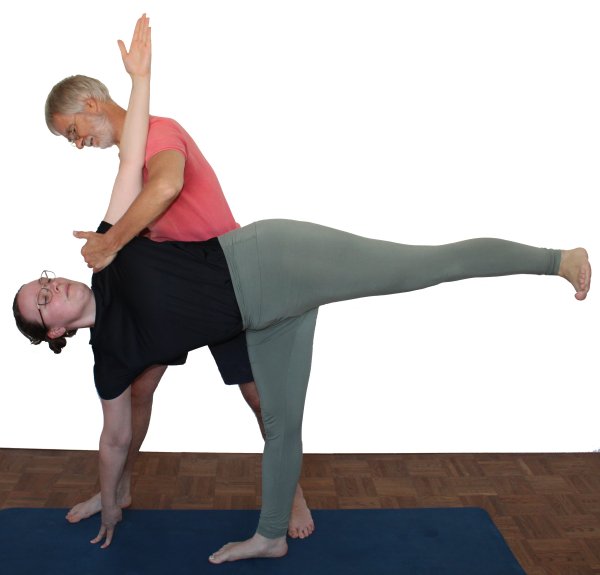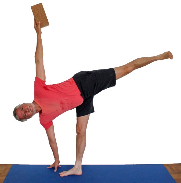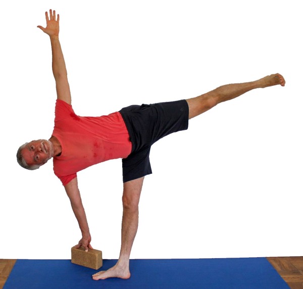 - Da eine ruhige Positionierung der Finger am Boden für eine sichere Ausführung der Haltung sehr hilfreich ist, in vielen Fällen aber die Beweglichkeit der Hüftgelenke eingeschränkt ist, und daher das Aufsetzen der Fingerspitzen durch Dehnungsschmerz im Standbein eingeschränkt oder verhindert wird, muss man „den Boden näher heranbringen“. Häufig wird, um die Fingerspitzen zum Boden zu bringen, der Oberkörper in eine seitliche Kurve gebracht. Auch die Notwendigkeit dazu sollte mit Verwendung des Klotzes i.a. entfallen.