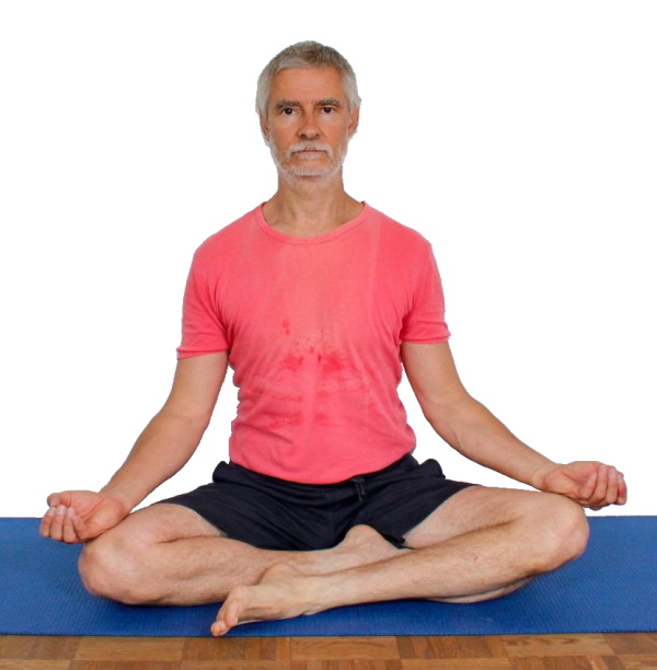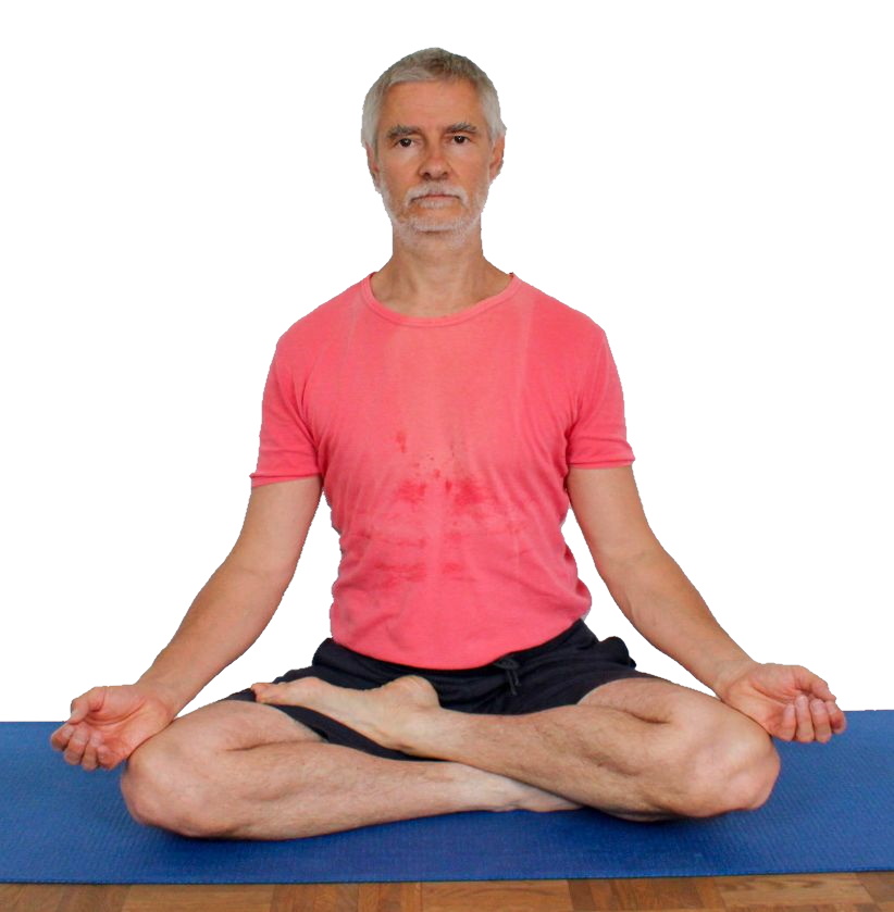 - Nimm die Haltung bzgl. des ersten Beins wie oben beschrieben ein, drehe dann das zweite Bein gut aus, lege den Fuß aber nicht auf den ersten Oberschenkel, sondern vor dessen zugehörigem Unterschenkel auf den Boden ab.