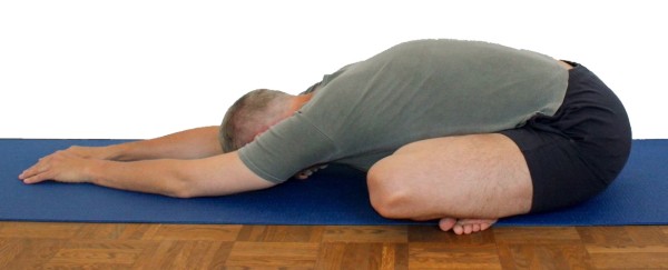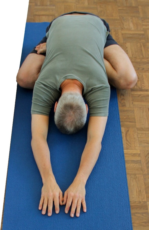 - Wenn möglich lege die Stirn auf dem Boden ab und strecke die Arme vom Körper weg nach vorn.