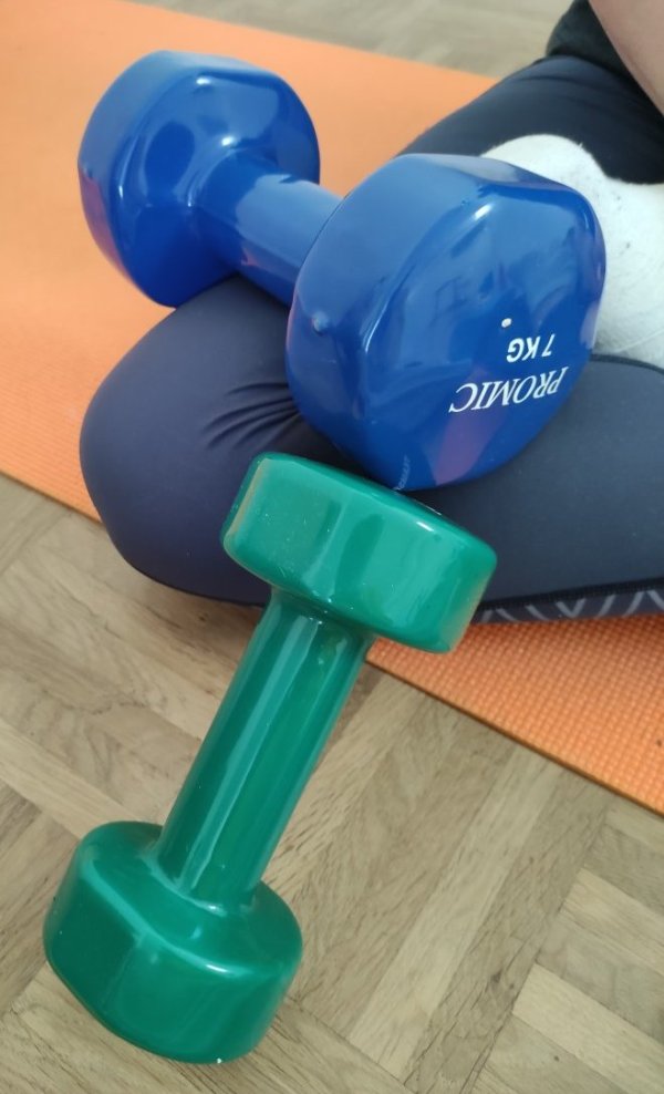 - Bei Problemen im Innenknie kann die Hantel die Situation verschlechtern, vor allem im Fall von Meniskusbeschwerden. Dann wird es noch wichtiger sein, beim Aufbau der Haltung die beiden Oberschenkel sorgfältig im Hüftgelenk auszudrehen. Hilfreich sein kann dann auch, die stützende Hantel auf der äußeren Seite des Oberschnkels anzubringen, und der ersten Hantel die Möglichkeit zu geben ein wenig in Richtung Boden zu kippen, wodurch ein kleines innenknieentlastendes exorotierendes Drehmoment im Hüftgelenk entsteht.