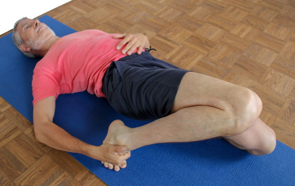 - Liege in ardha supta krouncasana, rechtes Bein zur Brust gezogen.