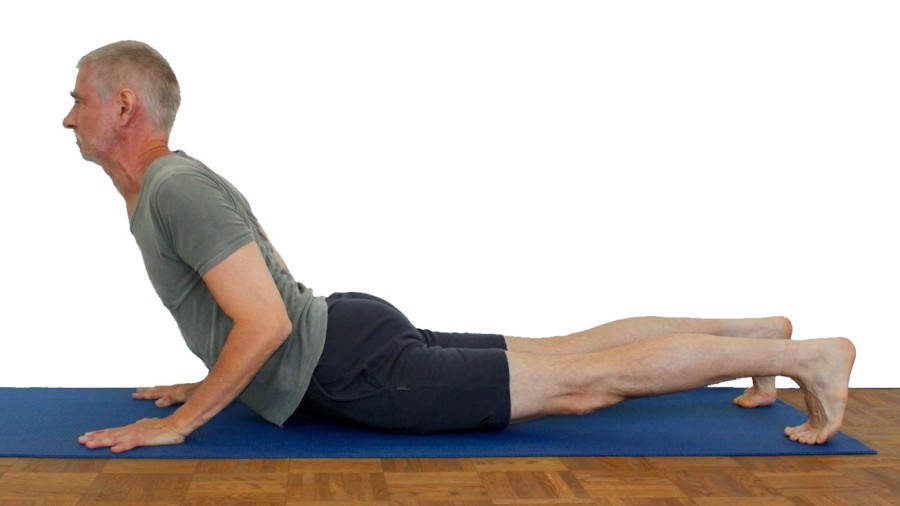 - Zuweilen wird der Unterschied zwischen der Hundestellung Kopf nach oben und der bhujangasana nicht klar aufgefasst: In der bhujangasana dürfen die Arme nicht durchgestreckt werden können, im Hundestellung Kopf nach oben müssen sie durchgestreckt – aber nicht überstreckt – sein. In der bhujangasana bleiben die Schambeinhöcker auf dem Boden, in der Hundestellung Kopf nach oben sind sie nicht auf dem Boden, bewegen aber zum Boden hin. In der bhujangasana ist vor allem der Trizeps aktiv, danach auch der Pectoralis und der vordere Deltoideus, im Hund Kopf nach oben sind neben den Palmarflexoren des Handgelenks vor allem die Frontalabduktoren des Schultergelenks aktiv. Die Fähigkeit, den Körper nach hinten zu drücken und damit auch die Fußgelenke in immer weitere Dorsalflexion, ist im Hund Kopf nach oben ungleich ausgeprägter. Gemein ist beiden Haltungen hingegen, daß die Kniegelenke gegen die aus dem Zug des Iliiopsoas resultierende Beugeneigung intensiv mit dem Quadrizeps gestreckt werden und daß die BWS extensiert, jedoch weniger aus Kraft der autochthonen Rückenmuskualtur.