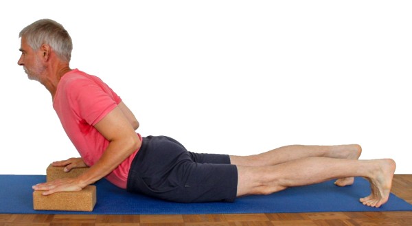 - Falls sehr gute Beweglichkeit in der Wirbelsäule und den Hüftbeugern gegeben ist, kann es vorkommen, dass die Arme immer durchgestreckt werden können, egal wo die Hände positioniert werden. Üblicherweise würde man wie oben beschrieben, die Hände weiter nach hinten setzen, damit die Arme nicht mehr strecken können. Bei sehr guter Beweglichkeit reicht dieser Mechanismus allerdings nicht aus, da ab einem gewissen Punkt Handgelenke im Lotpunkt der Schultern bei maximal angehobenem Oberkörper) das weitere nach hinten Verschieben nur dazu führt, dass der Schulterbereich bei durchgestreckten Armen weniger weit angehoben wird, als er könnte und zudem die Handgelenke in Winkel der Dorsalflexion gezwungen würden, die sie eventuell nicht leisten können. Um die Verhältnisse günstiger zu gestalten ist die Unterstützung mit einem oder zwei Klötzen nötig, die unter die Hände gelegt werden, so dass bei maximalem Anheben des Oberkörpers die Arme nicht durchgestreckt sind.
