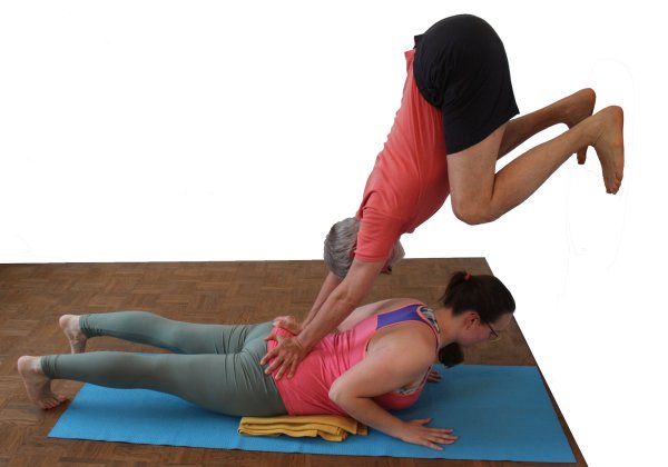 - Dieser Support ist recht ähnlich dem in der supta virasana, nicht nur weil der Supporter einen rechtwinkligen Handstand auf dem Ausführenden ausführt, sondern auch, weil in beiden Fällen die Flexion in den Hüftgelenken dadurch vermindert bzw. die Extension gefördert werden soll. Nur in den Bereichen, auf die Druck ausgeübt wird unterscheiden sich die Varianten: hier wird der Druck dorsal auf die Pobacken ausgeübt und in supta virasana ventral auf die SIAS.