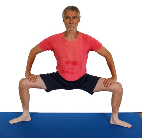 - Drehe die Füße so, dass sie bezüglich ihrer Mittellinien parallel zu den Oberschenkeln stehen. Die aus Hüftgelenk, Ferse und Knie gebildete Ebene soll möglichst senkrecht stehen. Wenn diese Ebene deutlich von der Senkrechten abweicht (sich neigt) entsteht eventuell ungesunder Druck im Knie, ob im Innen- oder Außenknie ist davon abhängig, ob das Knie vor der gedachten senkrechten Ebene durch Hüftgelenk und Fußgelenk steht (dann ist der Druck oder Schmerz meist im Innenknie) oder dahinter (dann meist eher im Außenknie), es ist also stark abhängig von der Dehnfähigkeit der Adduktoren. Die Arbeit des Gluteus maximus, die Knie nach hinten zu ziehen, entlastet die Kniegelenk.