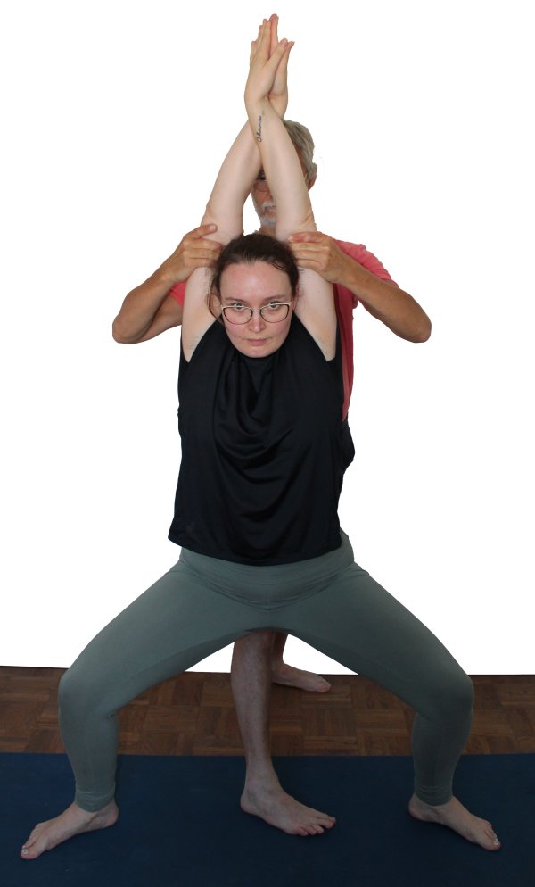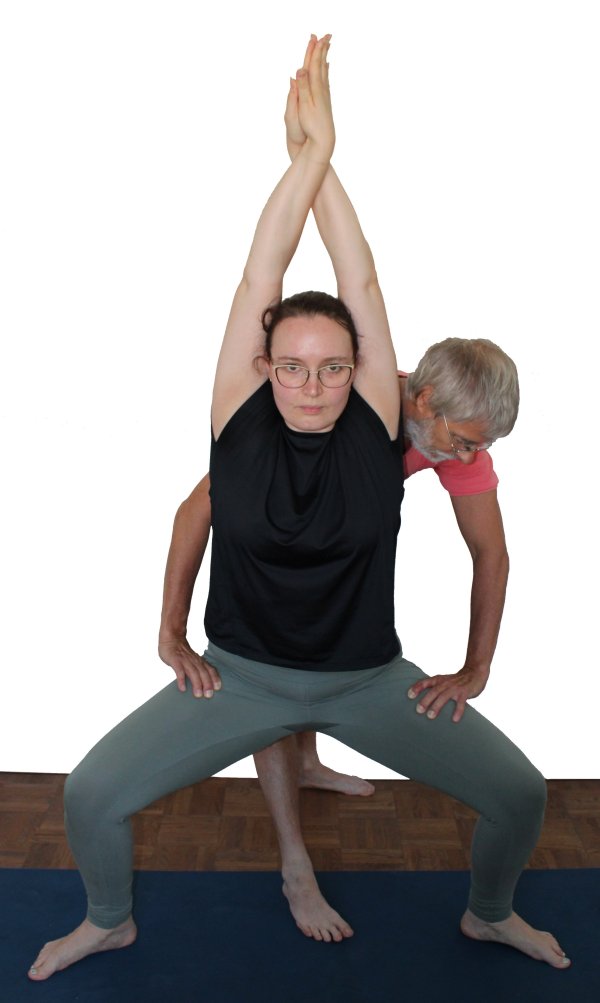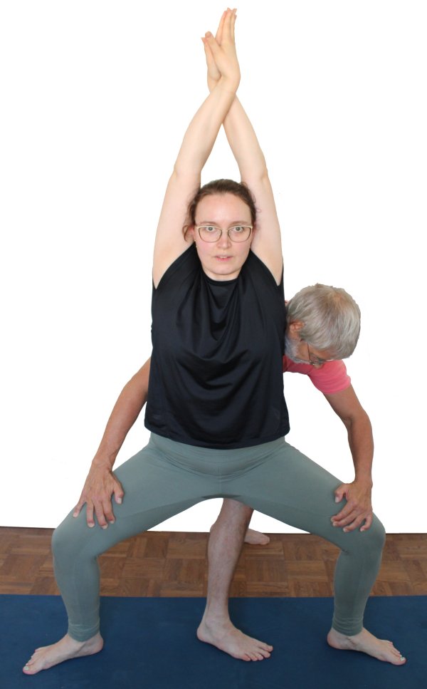 - Der Supporter steht hinter dem Ausführenden und dreht die Oberschenkel relativ nah an den Knien mit den Händen so weit als möglich aus ohne die Balance der Haltung zu beeinträchtigen, also ohne nach hinten zu ziehen oder nach vorn zu drücken.