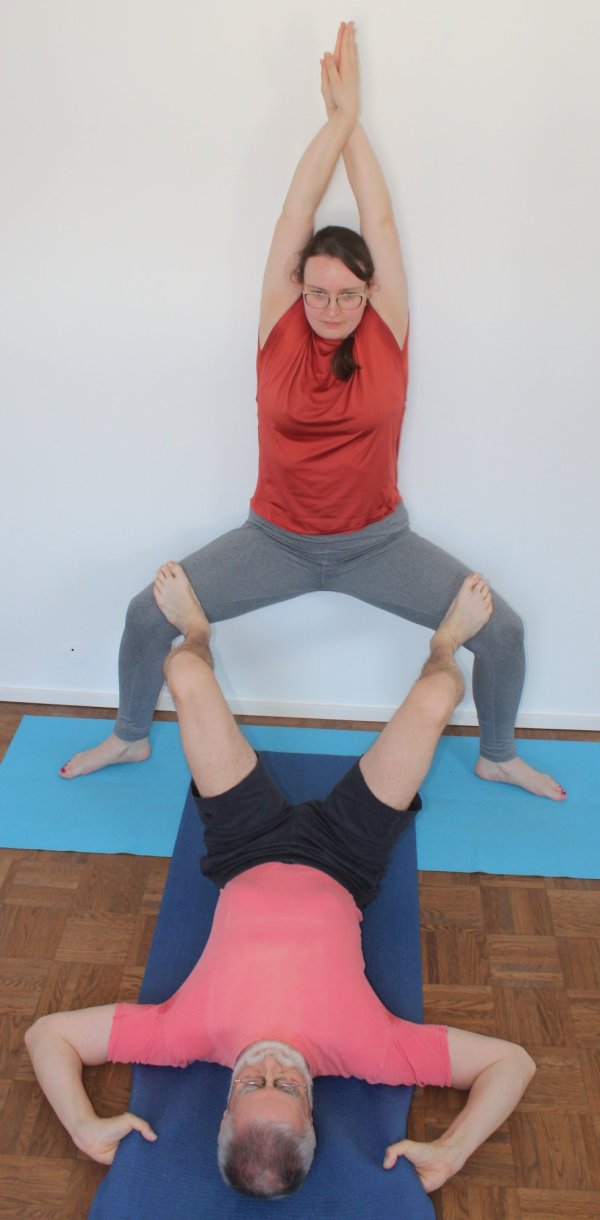 - Der Ausführende steht in caturkonasana mit dem Po an der Wand. Der Assistent liegt derart auf dem Rücken vor ihm, dass er mit den Füßen die Oberschenkel in der Nähe der Knie in Richtung Wand drücken kann.