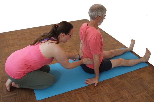 - Eine der größten Schwierigkeiten in dandasana ist in der Regel das Becken aufzurichten. Hier sind oft Einschränkungen der Flexibilität der Ischiocruralen Gruppe vorhanden, die dies verhindern. Durch den externen Druck können die Hüftbeuger des Ausführenden entlastet und unterstützt und die Krampfneigung des Rectus femoris vermindert oder abgestellt werden.