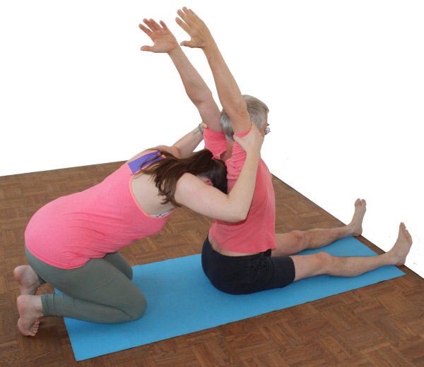 - Für die Arme bietet sich ein Kreuzgriff an, bei dem der Supporter mit der rechten Hand den linken Arm des Ausführenden von innen greift und umgekehrt. Dieser führt zu mehreren wünschenswerten Effekten gleichzeitig: einerseits werden die Arme zueinander und zum Supporter hin gezogen, andererseits erzeugt der Zug an den Innenarmen ein wünschenswertes Exorotationsmoment in den Schultergelenken.