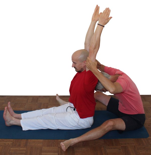 - Der Supporter kniet hinter dem Ausführenden und zieht achtsam und langsam die beiden Oberarme gleichmäßig nach hinten während er mit dem Kopf zwischen den Schulterblättern in gleichem Maße Gegendruck erzeugt.