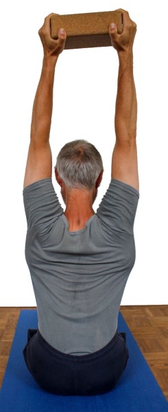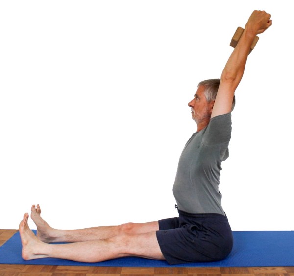 - Nimm dandasana wie oben beschrieben ein, halte dabei über Kopf bei gestreckten ausgedrehten Armen einen Klotz zwischen den Händen und ziehe von seitwärts mit beiden Händen daran.