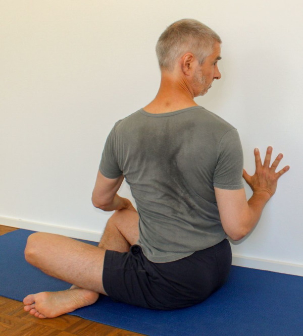- Je nach Körperproportionen wird die Hand, die auf dem Boden aufsetzen soll, dies möglicherweise nicht können, da der Arm zu kurz ist, das tritt auf bei sog. Sitzriesen. Benutze dann wenigstens soviel Unterstützung, z.B. durch einen Klotz, dass der Ellbogen leicht gebeugt sein kann. In dem nach vorn schiebenden Arm muss die Arbeit des Bizeps spürbar werden. Es wird mit aller verfügbaren Muskulatur die Hand gegen die Reibung des Bodens (der Matte) nach vorn (in die gleiche Richtung wie das Brustbein zeigt) geschoben. Da die Hand am Boden fixiert ist, bewirkt auch die Beugung des Ellbogengelenks einen Druck des Oberarms und der Schulter nach hinten und damit mehr Drehung. Gleichzeitig arbeitet auf dieser Seite der vordere Bereich des Deltoideus und der Pectoralis major. Auf der anderen Seite sollte der Latissimus dorsi, ein wenig der Bizeps und die Unterarmmuskulatur spürbar werden.