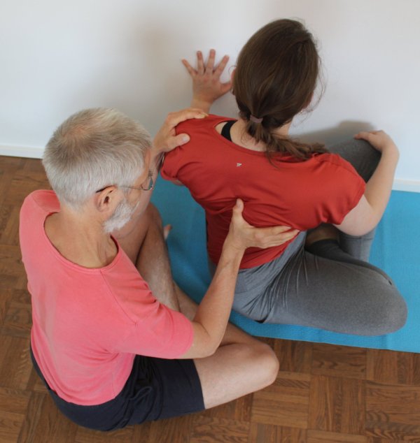 - Zusammen mit der Neigung des Oberkörpers kyphotisch zu krümmen tritt eine leichte Seitkippneigung (Lateralflexion vor allem der BWS) auf. Die Schulter, deren gleichseitige Hand am Knie zieht oder auf dem Boden nach vorn schiebt, wird dazu neigen, gegenüber der anderen zu fallen, verbunden mit einer leicht seitwärts schräg stehenden BWS. Auch dem muss entgegengewirkt werden. Weiter müssen die Schulterblätter nach unten gezogen werden und bleiben, also in die Depression. Insbesondere das Schulterblatt, dessen gleichseitige Hand auf dem Boden ist, bzw. in der Variante „an der Wand“ auf die Wand drückt, wird häufig unbewußt ein wenig hochgezogen.