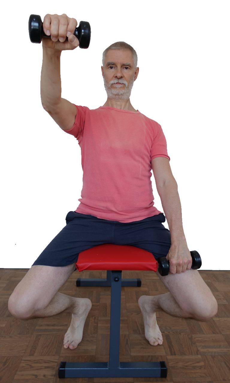 - Wenn die eine Hantel die Waagerechte um ca. 45° überschritten hat, lasse sie langsam wieder sinken.