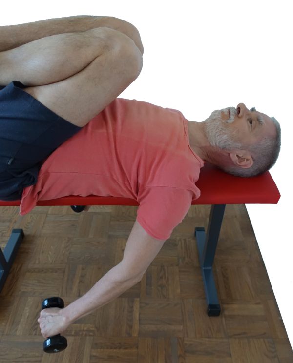 - Führe die oben beschriebene Frontalabduktion in den Schultergelenken in Rückenlage aus, z.B. auf einer Hantelbank, näheres siehe Details.