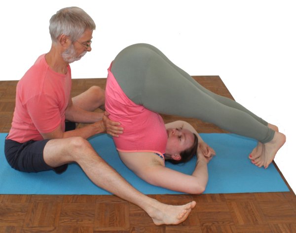 - Der Supporter fasst das Becken von der Seite um es besser aufzurichten, so dass sich das Becken mehr der Senkrechten annähert. Dabei wird das Becken auch angehoben, damit die Wirbelsäule besser strecken kann.