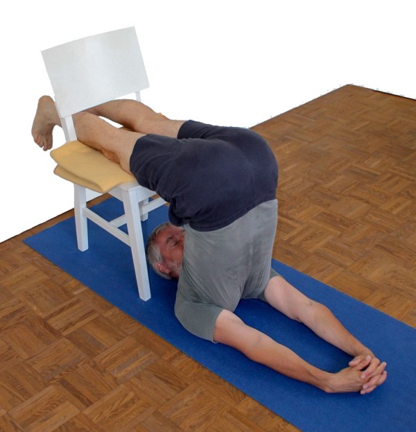 - Diese Variante stellt eine deutliche Entschärfung der Grundhaltung dar. Wie dort beschrieben erzwingen bei den meisten nicht besonders beweglichen Menschen die Einschränkungen in BWS/HWS und Ischiocruraler Gruppe eine Krümmung des Rückens. Sind die Beine auf einem Stuhl und liegen damit etwa waagerecht statt bei Füßen auf dem Boden deutlich schräg zu stehen, stellt dieses eine wesentliche Entlastung bzw. verminderte Anforderung dar. Die HWS muss etwas weniger stark beugen und von den Beinrückseiten wird deutlich weniger Beweglichkeit gefordert. Auf der anderen Seite wird natürlich damit auch die Kräftigungsarbeit der autochthonen Rückenmuskulatur begrenzt, die in dieser Haltung möglich ist.
