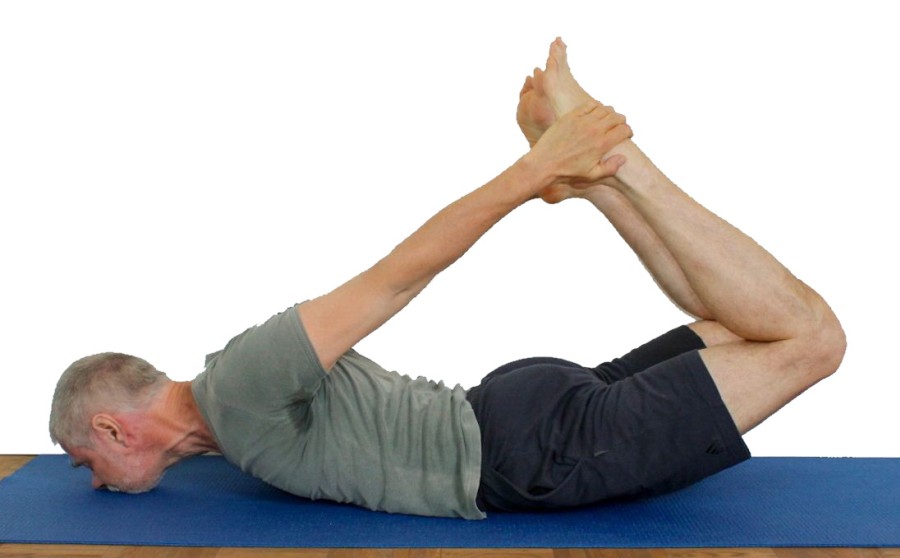 - Der Ausführende liegt bäuchlings auf dem Boden, beugt die Knie und greift mit den Händen die Fesseln um mit Kraft der Arme die Knie vom Boden hoch zu ziehen.