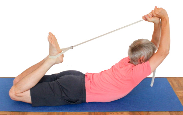 - Nimm die Haltung wie oben beschrieben ein, ziehe aber vermittels eines Gürtels an den Füßen statt direkt mit den Händen.