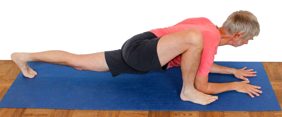 Hier handelt es sich nicht um eine Haltung, in der wie so oft eine verminderte Beweglichkeit der Hüftbeuger ein Hohlkreuz auslöst, dafür wird aber das Becken nicht weit sinken können und die Beugeneigung im Kniegelenk des gestreckten hinteren Beins ist sehr hoch.