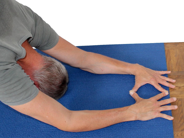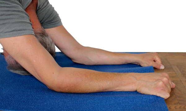 - Bewege die radialen Seiten (daumenwärts) der Hand und des Handgelenks soweit als möglich zum Boden. Möglich wird dies erst in Kombination aus Palmarflexion im Handgelenk, Pronation des Unterarms und Streckbewegung im Ellbogengelenk.
