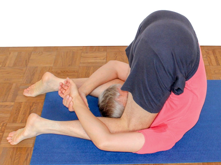 - Bekanntermaßen ist die Art und Weise, wie eine Haltung eingenommen wird, mitentscheidend dafür, wie sie wird und wie sie sich anfühlt. Wird versucht, den Oberkörper bestmöglich an den Beinen zu halten, ergibt sich möglicherweise ein besserer Kontakt des Oberkörpers zu den Oberschenkeln als er in einer konventionell mit gestreckten Knien von oben aufgebauten uttanasana erreicht werden könnte. Außerdem profitieren diejenigen mit einer Reizung des Ursprungs der Ischiocruralen Gruppe am Sitzbein (die PHT, siehe dazu auch die FAQ) davon, wenn erst die Hüftgelenke maximal in die Flexion gebeugt werden, wie es im Übergang der Fall ist, und danach die Kniegelenk gestreckt werden. Was genau auf die Beine gepresst werden kann, hängt natürlich sehr von der Beweglichkeit der Ischiocruralen Gruppe ab. Ist sie gut, können selbst bei gestreckten Beinen noch die unteren Rippen und ein Teil der Bauchdecke auf die Beine gepresst werden und möglicherweise zusätzlich die Stirn auf die Unterschenkel, oder es kann gar der Kopf durch die Beine gesteckt werden.
