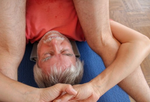 In karnapidasana kann Druckempfindung im Kehlbereich auftreten: