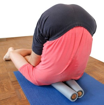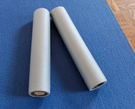 - Als Rollen eignen sich solche, die nicht zu dick sind (in der Größenordnung von ca. 5 oder 6 cm Durchmesser), nicht zu hart, damit der Druck erträglich ist, aber auch nicht zu kompressibel, damit überhaupt nennenswerte Wirkung zustande kommen kann. Als geeignet erweist sich etwa ein hölzener Rundstab von 3,5 bis 4 cm Durchmesser umgeben von einem Schaumstofftubus, wie er als Isolierung im Heizungsbau verwendet wird. Das Resultat ist von außen genügend weich, die Kompression begrenzt sich aber aber auf den Durchmesser des Holzkerns.
