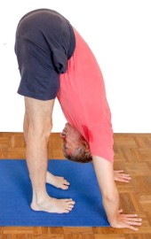 - Beim Übergang zu uttanasana kann natürlich auch deren Variante mit Griff der Hände zu den Fesseln geübt werden, um den Oberkörper besser an den Oberschenkeln halten zu können.