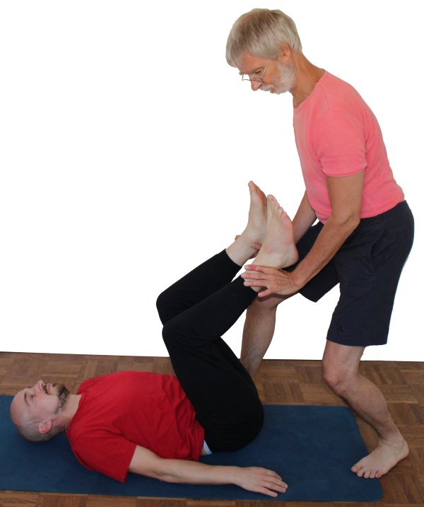 - Der Ausführende liegt in supta dandasana, winkelt aber die Knie ein wenig an.