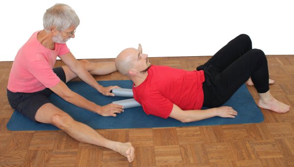 - Der Supporter sitzt hinter dem Rücken des Ausführenden und legt anzubringenden Rollen V-förmig dorthin, wo er die Schulterpartie des Ausführenden zu liegen zu kommen erwartet. Dabei hat das zu Becken zeigende Ende der Rollen Kontakt miteinander, das andere Ende liegt mehr als kopfbreit auseinander.