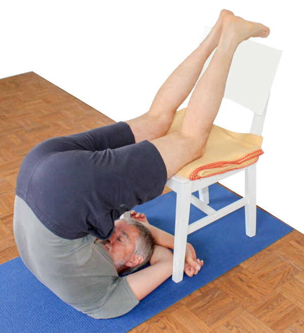 - Führe karnapidasana wie oben beschrieben aus, lege jedoch nicht mit gebeugten Knien die Füße auf dem Boden ab sondern die gestreckten Beine auf einem Stuhl.