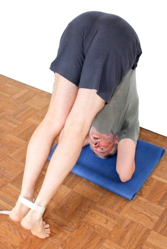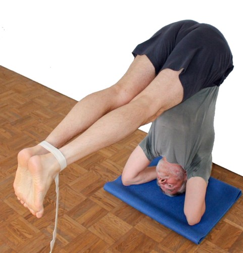 - Binde die Füße an den Fesseln eng zusammen und schwinge wie oben beschrieben langsam, kraftvoll beidbeinig und mit gestrecktem Rücken auf in den Kopfstand.