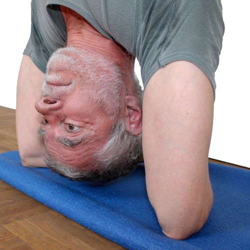 - Diese Variante macht ein wenig mit dem rechtwinkligen Kopfstand vertraut, lässt allerdings die kräftigende Wirkung auf die Rückenmuskulatur vermissen und dient damit nicht als Ersatz für diese. Aus dem Druck der Ellbogen auf den Boden kann hier der Druck der Fersen auf die Wand vergrößert werden.