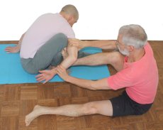 - Beachte, daß sich das Ellbogengelenk nur dann in die gewünschte Richtung beugen und der Unterarm nach hinten bewegen läßt, wenn der Arm genügend weit im Schultergelenk eingedreht ist. Wenn die Finger sich nicht auf dem Rücken treffen können, gibt der Supporter dem Ausführenden einen Gürtel, so dass die freie Hand am Gürtel die das Bein umgreifende Hand ziehen kann.