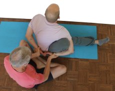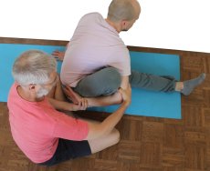 - Maricyasana 3 ist je nach Flexibilität von Oberkörper und Hüften wesentlich schwieriger als maricyasana 1. Aber auch hier hängt das Gelingen von der Schulter-, Oberkörper- und Hüftbeweglichkeit ab. Im Schultergelenk ist eine gewisse Retroversionsfähigkeit des Arms zusammen mit einer gewissen Endorotationsfähigkeit erforderlich. Die Muskulatur des Hüftgelenks muss eine ausgeprägte Flexion zulassen und der Oberkörper muss gut rotieren können. Bei all diesen Bewegungen kann der Supporter unterstützen, indem er den Arm, der das Bein umgreifen soll, kraftvoll, aber natürlich nicht ruckartig, nach vorn zieht, während er mit einem Fuß den Unterschenkel des Ausführenden zum Oberkörper und in die Achselhöhle drückt. Gelangt dann der Ellbogen selbigen Arms ein deutliches Stück vor den Unterschenkel, stehen die Chancen gut, dass der Arm das Bein umgreifen kann. Dies erlaubt noch keine Aussage darüber, ob sich die Hände auf dem Rücken treffen können, jedoch ist es eine notwendige Bedingung dafür. Es ist hilfreich, wenn der Supporter den Druck seines Fußes frühestens zurücknimmt, wenn der Arm das Bein umgriffen hat. Um das zu erreichen dreht der Supporter mit einer Hand den Oberarm ein und hält ihn so tief wie möglich, mit der anderen Hand führt er den Unterarm um den Unterschenkel, wobei sich das Ellbogengelenk entsprechend beugt.