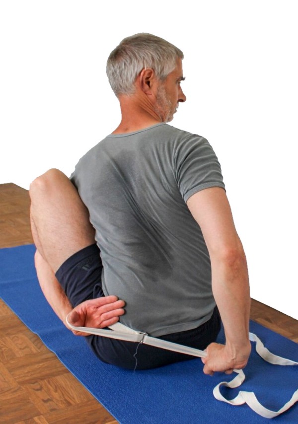 - Führe die Haltung wie oben beschrieben aus, bei fehlender Möglichkeit, mit den Fingern der linken Hand an die der rechten zu gelangen, benutze einen Gürtel, der von beiden Händen umgriffen wird, und an dem die freie Hand die das Bein umgreifende nach hinten-unten zieht.