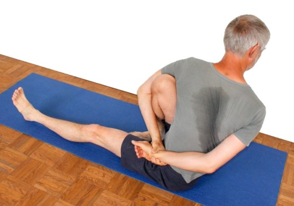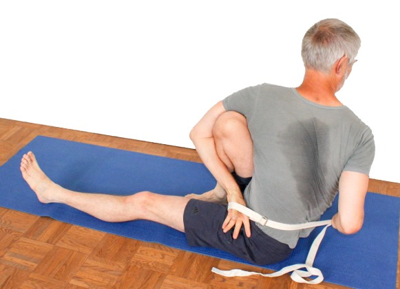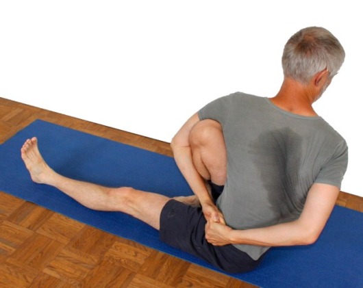 - Es gibt neben dem genannten noch einen Trick, um den Ellbogen des Arms, der das Bein umgreifen soll, weiter nach vorn zu bewegen: Beuge das gestreckte Bein so weit und hebe dabei dessen Ferse so weit an, daß du mit der kontralateralen Hand den Außenfuß greifen kann. Dann strecke das Bein wieder durch. Dabei wird die Schulterpartie nach vorn gezogen und das Umgreifen des Bein erleichtert. Der Griff zum Außenfuß um den Oberkörper nach vorn zu ziehen und die Flexion der Hüftgelenke zu verbessern, ist eine Analogie zum gleichen Verfahren in maricyasana 1: