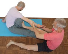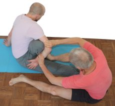 - Der Supporter zieht dann den Arm zu sich heran bis dessen Ellbogen deutlich vor den aufgestellten Unterschenkel des aufgestellten Beins des Ausführenden gelangt ist, drehe dann den Arm ein, um ihn danach im Ellbogengelenk zu beugen sobald erkennbar ist, dass die Hand über den Oberschenkel des gestreckten Beins geführt werden kann.