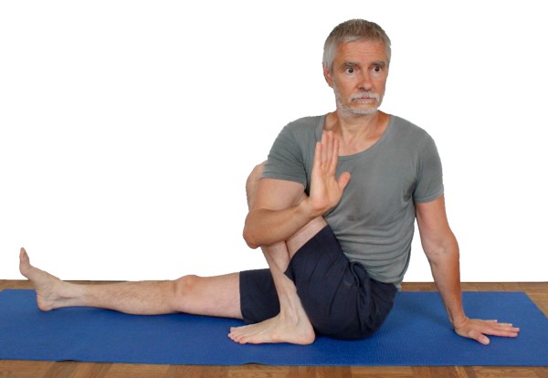 - Das Herunterdrücken des linken Fußes gibt Stabilität für die Drehung. Weitere Kraft für die Drehung kann man aus dem leichten nach rechts Drücken des rechten Beins beziehen. Diese kleine Bewegung soll gegen den Widerstand des Bodens geschehen und sollte nicht zum Krampf in den rechten Abduktoren führen, sonst lasse etwas nach. Die Krampfneigung der Abduktoren ist hier allerdings deutlich geringer als die der Adduktoren in maricyasana 1.