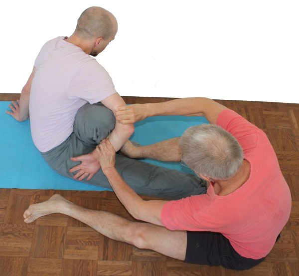 - Um die Hände des Ausführenden bestmöglich zusammenzuführen, kann der Supporter hinter dem Rücken des Ausführenden sitzend mit einer Hand an der Schulter des freien Arms ziehen, während er mit seinem Unterarm gegen den zugehörigen Oberarm des Ausführenden drückt, um diesen Arm dem das Bein umgreifenden Arm anzunähern. Damit unter dem Zug an der Schulter der Oberkörper nicht nach hinten (dorsal) gezogen wird, stützt der Supporter mit dem Kopf am Rücken des Ausführenden ab. Mit der anderen Hand zieht der Supporter den Ellbogen der das Bein umgreiffenden Hand des Ausführenden in Richtung der Hand des freien Arms.