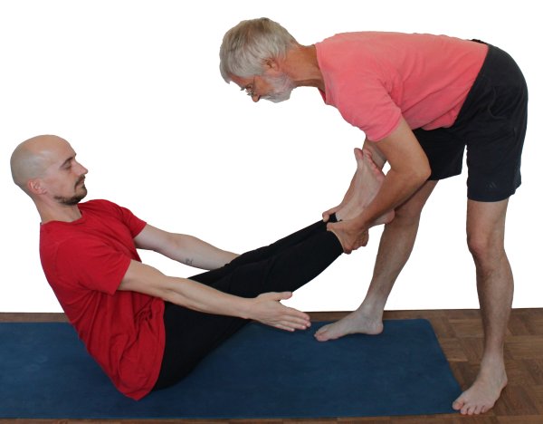 - Der Supporter fasst beide Fesseln und hebt die Beine an bis der Gleichgewichtszustand erreicht ist.