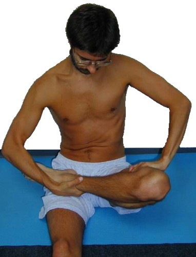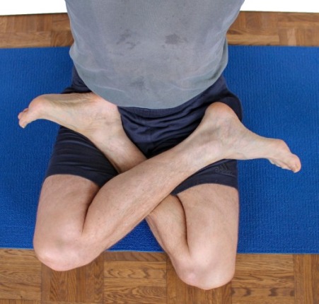 - Im Original sind die Fußgelenke (genau: die äußeren Maleolen) auf den Oberschenkeln abgelegt, so dass die Fußgelenke in der Haltung frei jeglicher Krafteinwirkung außer der eigenen Schwerkraft sind. Dies erfordert jedoch sehr gute Beweglichkeit, die in vielen Fällen nicht hinreichend gegeben ist. Kann die dafür angeforderte Exorotation in den Hüftgelenken nicht mit Leichtigkeit bereitgestellt werden, erzeugt dies neben deutlich wahrnehmbarem Druck der Malleolen auf die Oberschenkel auch nicht unbedingt wahrnehmbare ungute Kräfte im Kniegelenk im Sinne von Varusstress und Endorotation, die wie weiter oben bereits dargestellt in Summe eine deutliche Belastung insbesondere des Innenmeniskus darstellen. Bei bestehenden Meniskusschäden ist diese Einwirkung meist relativ schnell nach Einnehmen der Haltung klar zu spüren, möglicherweise schon unmittelbar beim Einnehmen. Diese Variante soll eine Erleichterung diesbezüglich darstellen, da sie etwas weniger Exorotation benötigt und den Varusstress vermindert, immerhin ist die erforderliche Höhendifferenz zwiscfhen Fußgelenk und Knie geringer.