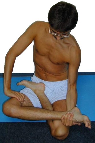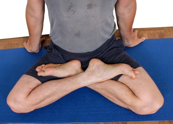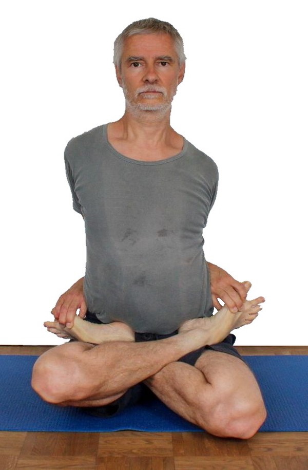 Dazu greife mit der kontralateralen Hand zu einem Außenfuß um diesen anzuheben, und mit der seitengleichen Hand zu den Sehnen der inneren Ischiocruralen Gruppe, um diese nach außen zu ziehen und das Knie nach unten zu drücken. Aus dem Einsatz beider Arme ergibt sich eine bestmögliche und schonend ausgeführte Exorotation im Hüftgelenk. - Ziehe beide Füße weit auf den jeweils anderen Oberschenkel, um eine übermäßige Inversion des Fußgelenks zu vermeiden. Die Fußgelenke sollen etwa mittig auf dem gegenüberliegenden Oberschenkel liegen, damit die Füße leicht beweglich sind und damit im Fußgelenk kein dauerhafter Druck auftritt, der während längeren Sitzens störend und nach Beenden der Haltung eventuell kurzfristig schmerzhaft sein könnte. Die weit auf den Oberschenkel gezogenen Füße benötigen eine umso bessere Exorotationfähigkeit der Oberschenkel im Hüftgelenk als nur knapp auf den Oberschenkel gezogene, da die Fußgelenke gegenüber den Kniegelenken umso höher liegen müssen.